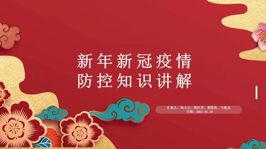 2021年1月28日,GY-059组组长杨玉宝,组员樊庆龙,翟晗爽,马秋杰由于所在地疫情严重,各小区实行封闭式管理,于是根据疫情调整方案,选择在线上开展第四学期疫情防控知识讲解。