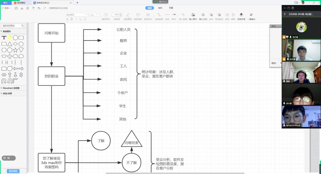 本次的讨论的主要目的是优化调研内容,修改先前的调查问卷。结合我们以代做3ds max效果图为课题的创业项目,我们一致认为调查问卷的结果必须能反映3ds max效果图的市场需求,从而确定我们的定价、质量、效果等指标。组长李庆霖通过绘制流程图的方式表达问卷各项之间的关系,使问卷条理清楚,问题明确。我们从对方职业、了解程度、是否有需(需求量、需求类、出图速度、价位)、支持度等方面列出问题及选项,并通过关系图的方式列出问卷流程。李长甜同学将会把图形语言翻译为文字语言,并制出网络问卷以及问卷传单。结合居住地疫情状况,本小组预计从2月4日起进行为期一周的调研活动,包括网络调研以及现场填写传单的调研形式,并分析调研问卷,总结出调研结果。