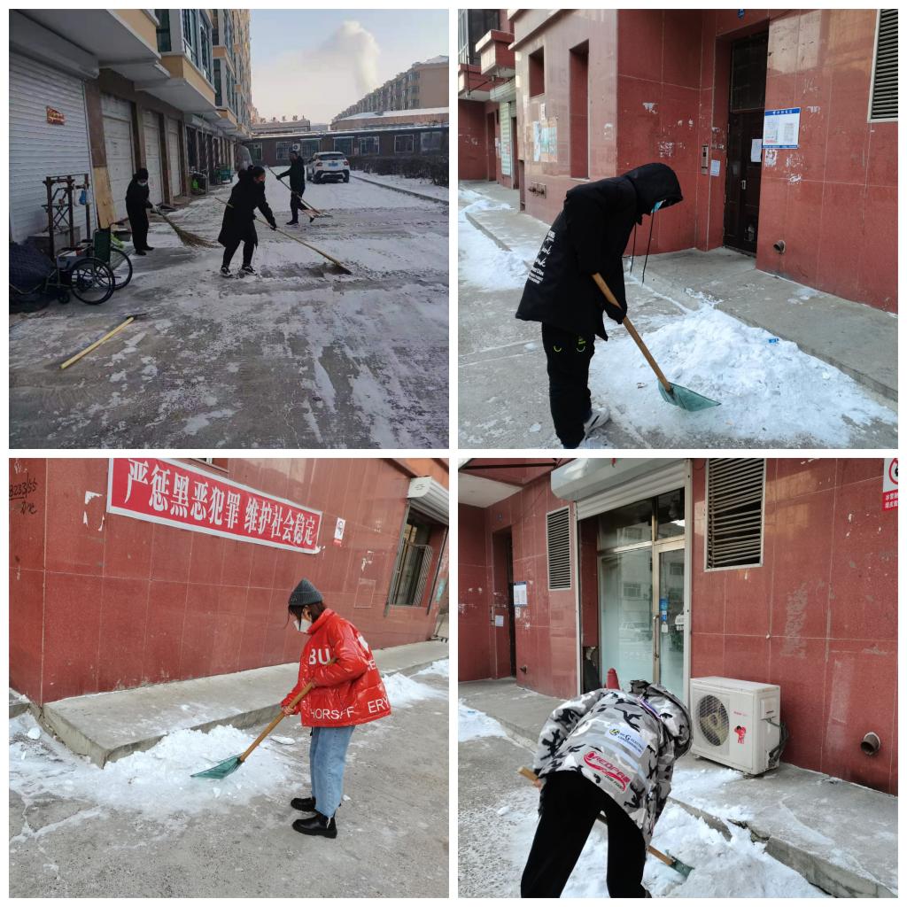 为了方便社区人民出行,维护社区环境美观。一月二十日下午,GY-312小组成员陆庆圆、刘子茜、丁佳雨、王子文在社区内进行自发性的室外清雪活动。