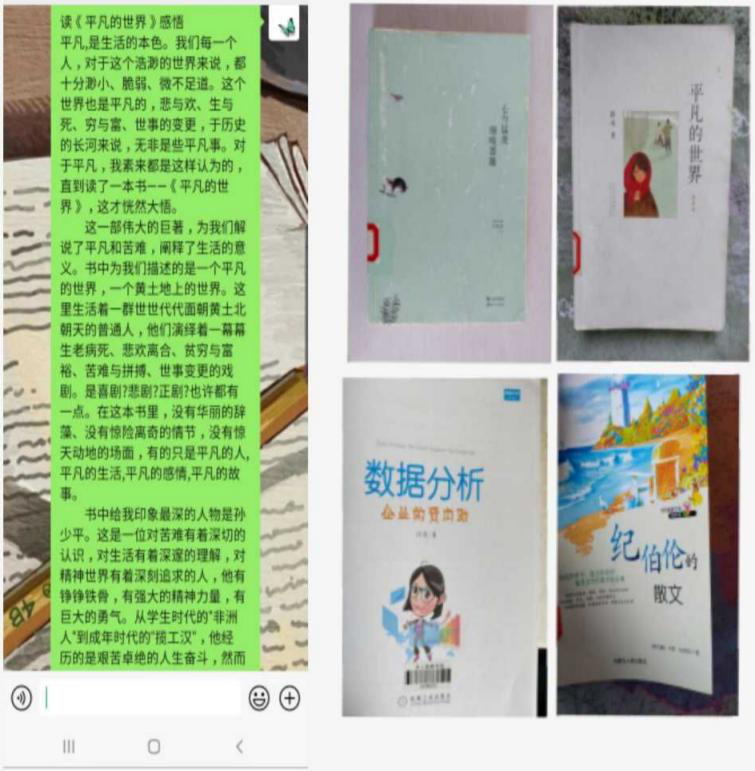 由于疫情的原因,本次读书活动以微信群线上交流分享的形式展开。我们主要针对放假前在学校图书馆所借阅的书籍进行交流讨论,并分享读书感悟。我们本次交流的书籍分别是《平凡的世界》、《纪伯伦的散文》、《数据分析》和《心有猛虎细嗅蔷薇》这四本书,经过各自的阅读与讨论我们了解到这四本书分别向我们展示了四种不同的风格。我们着重讨论了林默蕾笔下的《心有猛虎细嗅蔷薇》。“心有猛虎,细嗅蔷薇”是英国诗人西格里夫·萨松代表作《于我,过去,现在以及未来》的经典诗句,余光中先生曾说到:“人生原是战场,有猛虎才能在逆流里立定脚跟,在逆风里把握方向,才能创造慷慨悲歌的英雄事业和涵蕴耿介拔俗的志士胸怀,才能做到孟郊所谓的‘镜破不改光,兰死不改香!’同时人生又是幽谷,有蔷薇才能独隐显幽,体贴入微;才能看到苍蝇搓脚,蜘蛛吐丝,听到暮色潜动,春草萌芽,才能做到‘一沙一世界,一花一天国’。完整的人生应该兼有这两种至高的境界。”作为当代大学生,面对纷繁复杂的世界,更应该保持一份真诚和自信。