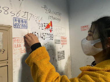 鉴于各社区小区的楼道和各处都粘贴小广告和宣传海报,这些小广告既影响美观有的甚至违反法律和一些不雅现象,我们对此开始了清理小广告的行动。我负责查看各处小广告的粘贴情况并作出标记;潘月同学负责用小铲子和钢丝球来清理易掉的广告;杨磊同学负责用小水枪和铲子清理顽固性广告,最后由我把清理下来的垃圾用扫帚扫在一起然后用锉子收起来倒进垃圾袋里,最后统一扔到垃圾桶里。