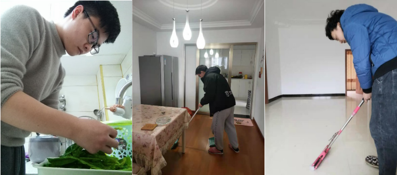 闫元源在家里拖地,李沅昊在家里扫地,吴冠霖在家里洗菜做饭。当父母疲劳时,我,们给他们倒上一杯浓茶,帮他们捶背;当我们在外面的时候,给父母打上一个电话,让他们不用担心;我们亲手做了一桌丰盛的大餐,让父母体验我们的手艺。我们清扫地面,然后拖地。定时给家里的花草浇水,我们在做我力所能及的小事,做好家务活,让父母开心。