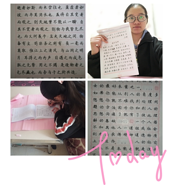 活动前我们都在家进行字帖临摹,让自己的字迹更加的美观大方。1月16日我们在线上进行了自己所临摹的字帖展示活动,小组成员都将自己书写的字体拍照发到群里进行展示。并跟大家分享了自己练字的感悟。小组成员都说练字是一个非常需要耐心的过程,想要把自己练好,需要很多的时间,需要我们坚持不懈的去练习,而不是心血来潮的练习一会儿,那样是不能提高的。练字还可以让我静心养性,可以让我们放松的同时提升自己。