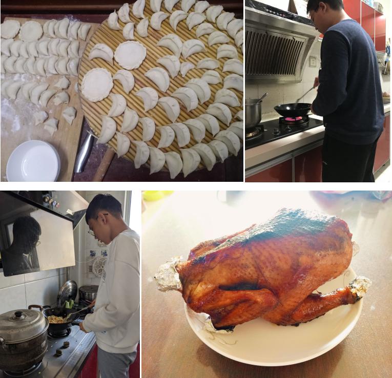 在本次活动中,小组四名同学在烹饪结束后通过QQ群展示成果。李庆霖同学为父母做了烤鸡;樊锐同学与邓文吉同学为父母炒了数道菜肴;李长甜同学为父母包了饺子。在感谢父母享用美食的同时,我们也与父母谈天说地,拉近了两代人之间的距离。一顿其乐融融的饭,一个团团圆圆的年,恰逢新春佳节之际,小组成员向其父母郑重地表达了感谢之情。