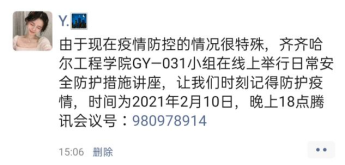 2021年2月10日晚18点在腾讯会议会议号:980978914 GY-031小组组长吴广月组员田佳宜 、常艺璇、商巧媛,线上展开了疫情日常安全防护措施相关讲座。