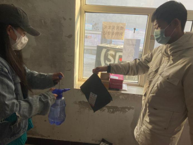 在疫情期间,快递物流应该是大部分人们和外界沟通的渠道之一了,而且正属于春节放假期间,快递更是多之又多。快递又是经过多个区域更是危险之物,所以我组决定对快递进行消毒公益活动。杨磊同学负责帮助快递小哥把快递集中放在一块区域;我和潘月同学负责对快递进行消毒覆盖;并对取快递人员进行消毒、并登记为防止以后出现问题。在工作过程中,情况非常乐观,大众的态度也非常的友好,能积极的配合我们的工作,没有为我们的工作造成一丁点的困扰和阻碍,我认为这一切都归功于人们思想的进步祖国的进步,时代的进步。