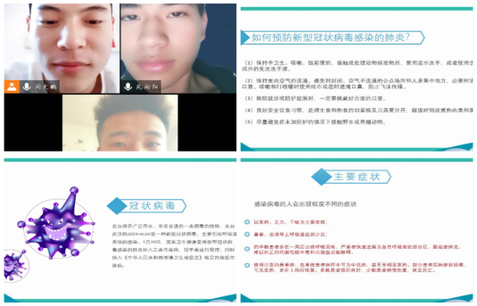 因新冠肺炎疫情仍然存在,所以我组成员于2021年2月21日在腾讯会议平台开展了关于新冠肺炎疫情的线上宣讲活动。活动举办时间共计一个小时二十四分钟,其中组长闫大鹏负责组织成员,安排活动时间,组员苑向阳负责活动的宣讲与介绍新冠肺炎疫情,组员张宇栋负责找线上宣讲所需PPT、视频。