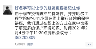 2021年2月10日中午11点30分,由于现在疫情防控的特殊性,齐齐哈尔工程学院GY-041小组在线上举行环境的保护讲座,组长周承霖,组员徐海峰,柳森,温新通过在线上的方式在家中也能了解更多的保护环境知识,主讲人徐海峰。