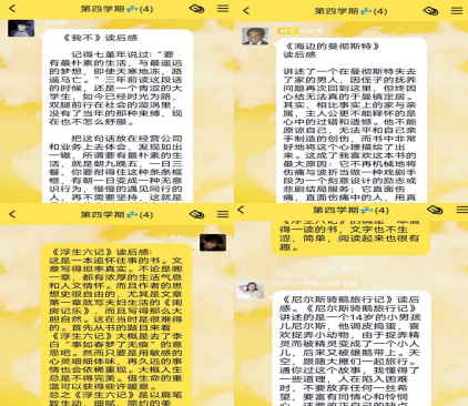 小组李金雪、刘鹏飞、王昊阳、刘宏博四名成员阅读书籍分别是《尼尔斯骑鹅旅行记》、《浮生六记》、《我不》、《海边的曼切斯特》。大家在阅读后在群中发表了自己的感想,切实体会到书中自有黄金屋。