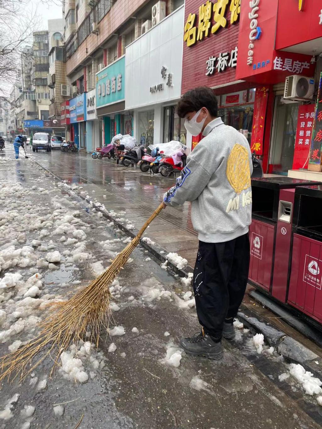 今天我们来到郑州市一条街道,开始商量打扫积雪。刚开始我们联系本地的环卫工人,征求他们同意,接着我们准备了工具开始打扫积雪。经过一个多小时的不懈努力,我们顺利将这条商业街道前的积雪打扫完毕,方便行人来这购物。