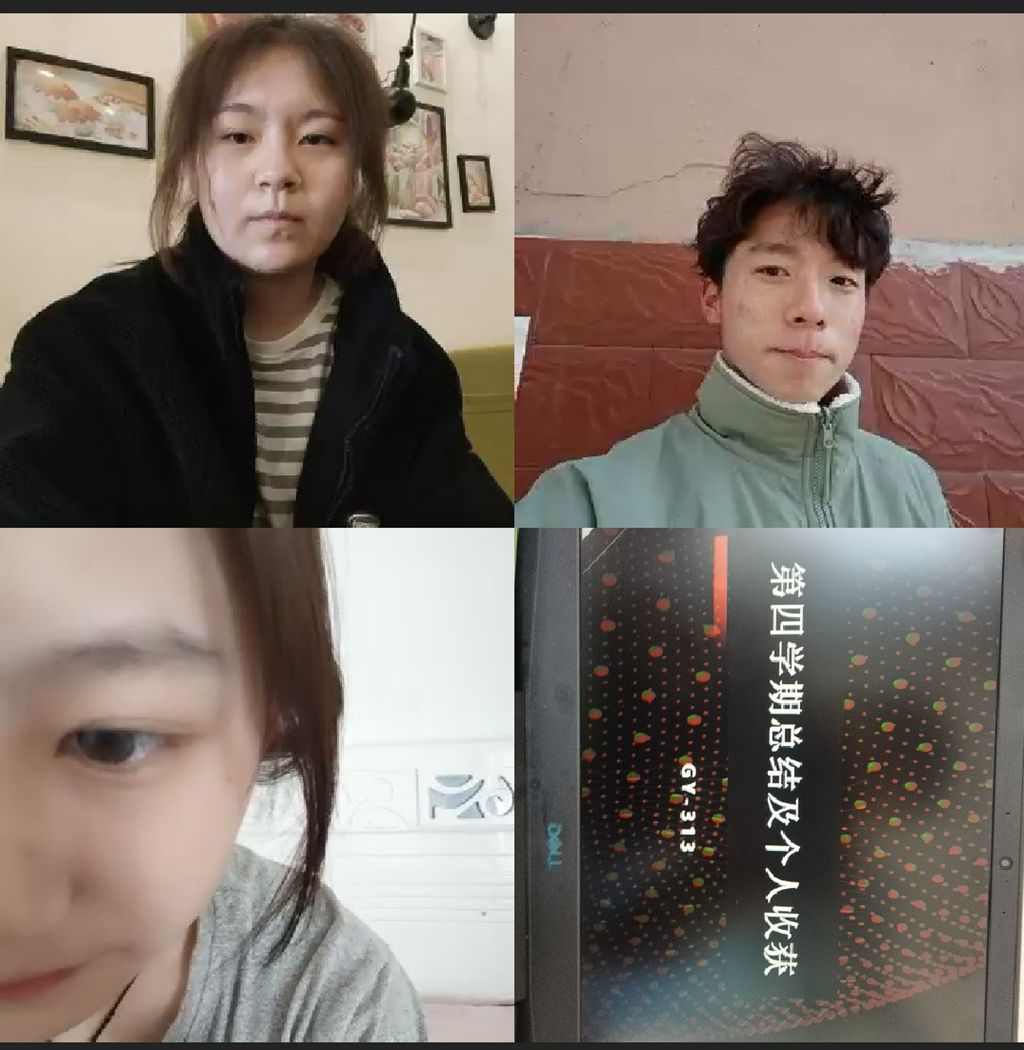 第四学期进行到尾声,GY-313小组2月25日,在进行社区防疫宣传的同时进行线上小组总结会,组内成员滕雨冉、何欣彤、刘守文、齐奇全员参加。会内每人都发表了自己在第四学期期间的收获和感慨,组长滕雨冉对第四学期工作进行总结。
