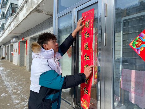 喜迎新春,春节即将来临,为浓厚的节日增添一份色彩,我们决定去帮助社区老人贴春联,我们在网上搜集资料,我们要用最原始的方法贴春联,这才能彰显出春的氛围,我们用网上的方法调制好粘稠的胶水,然后再买来春联,由姜彩依同学负责照相,孙凤奇和张振鹏同学负责粘贴春联,粘贴完毕后还要在检查一遍,防止掉落,我们一共贴了20多家,帮助有困难的老人们,并得到老人们的夸赞和感谢。所谓财源广进,新春吉祥,我们体会到助人为乐的喜悦也体会到公益活动的快乐,让我们回到了小时候老人们对我们的疼爱。