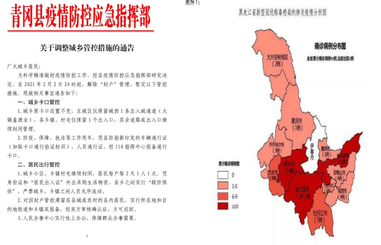 直到2月3日,黑龙江省绥化市青冈县疫情防控指挥部门发布重要通告,调整城乡管控措施,青冈县解除“封户”管理。今天起,青冈县居民终于可以每户每2天1人1次凭身份证和"居民出入证"外出采购生活物资了,只是城乡小区、乡镇村屯依旧处于封闭状态。这是我们在寒假期间对我们CY-030小组所在生源地进行的疫情调研。