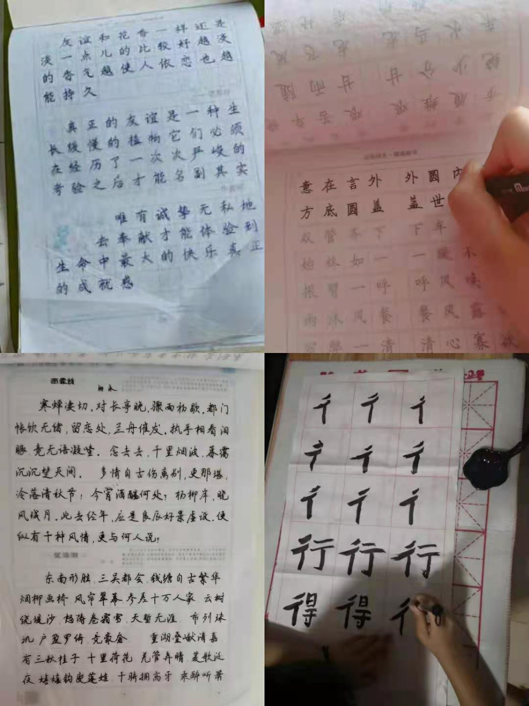 练字有很多好处,充分利用自己的碎片时间、能够让自己的内心安静下来。培养气质、给人好印象、现在人很多都是电脑打字、手机打字、手写字的时间变得越来越少。有些时候更是提笔忘字,如果一个人能写出一手漂亮的字,那么将是突出他个人能力的一种方式。是在学习和工作中无形的增加了竞争的筹码,也是提高考试、应聘中卷面分和第一印象的良好体现。甚至能收到更多朋友、同学、同事等的赞赏,为更好的提升我校学子的汉字书写能力,特开展此次线上活动。我组成员在组长的带领下每天坚持完成最低一小时的练习写字任务,并在小组群里拍摄照片、记录时长进行汇报。互相监督,充分培养组员自律的好习惯。也会每周在线上交流一次自己这段时间的收获、和心得体会。小组成员根据练字前后对比、练字时间长短进行小组内部打分。每周会针对最近练字的内容例如成语、唐诗、宋词、文言文等等。进行学习在开会期间讲给小组成员听,不仅能提升小组成员的语言表达能力还能学习更多以前不知道的知识。