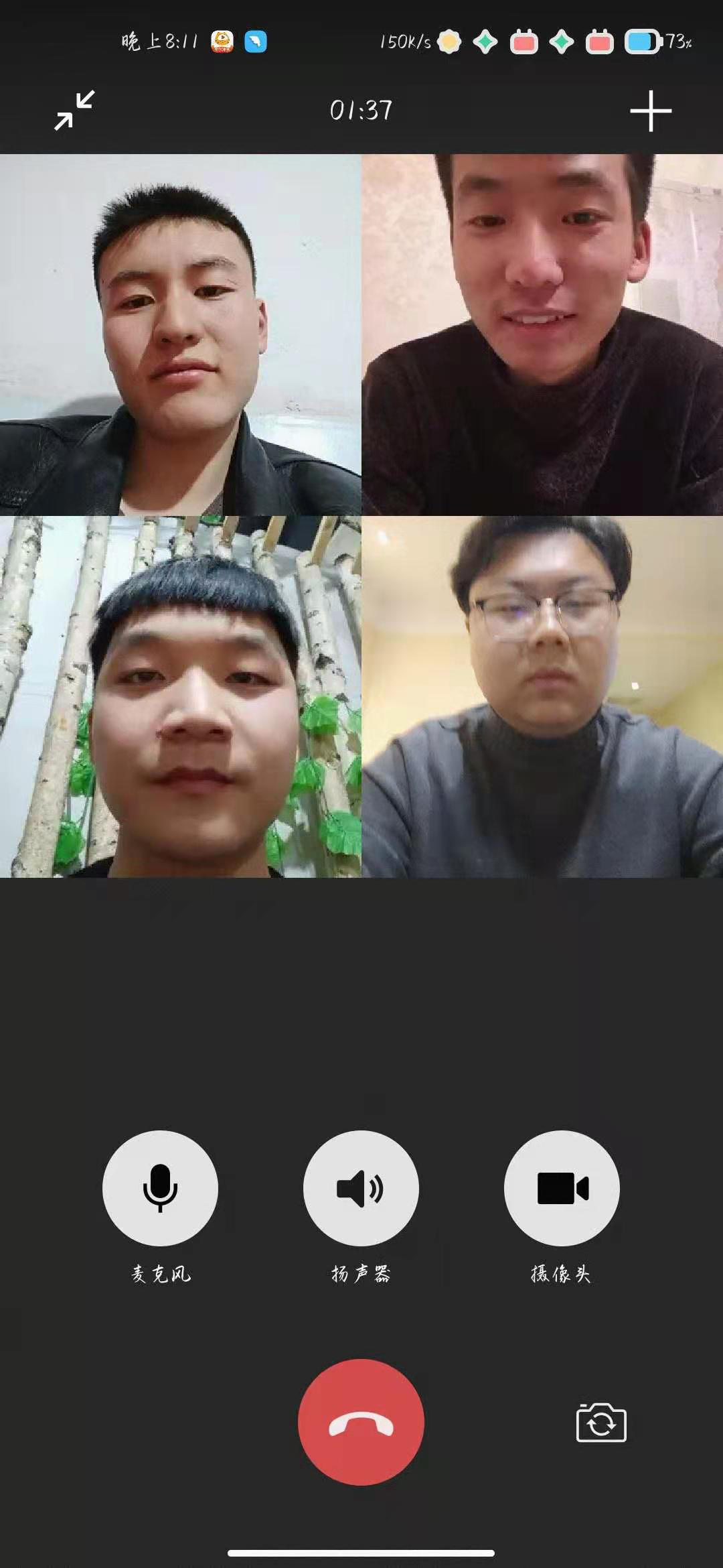 2月13日16时,为了响应号召,积极参与并完成第四学期实践活动,第四学期GY-175小组成员电气本201张向东,电气本201王明军,电气本202苏永康和电气本202朱昕四人在微信视频中开展了线上调查会议。