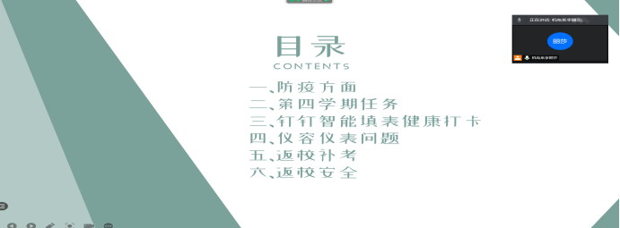 李丽莎老师的声音缓缓响起首先向大家介绍了自己然后向大家讲述应准备的事项并将主要内容分为六个部分,分别是防疫方面、第四学期任务、打卡、仪表、补考、返校安全。其中李丽莎老师特别强调了一定要注意安全,前往学校的过程中注意车辆注意自己的东西不要弄丢。最后李丽莎老师对本次会议进行了总结,作为返校的学子,自身的安全一定要有保障,积极参与到学校的日常个人信息签到当中,对自己的生命安全负责。
