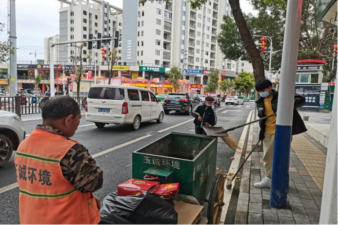 2月10号,由组长狄建周带领组员蒲朝江、郑心长、廖勇安帮助环卫工人打扫卫生。