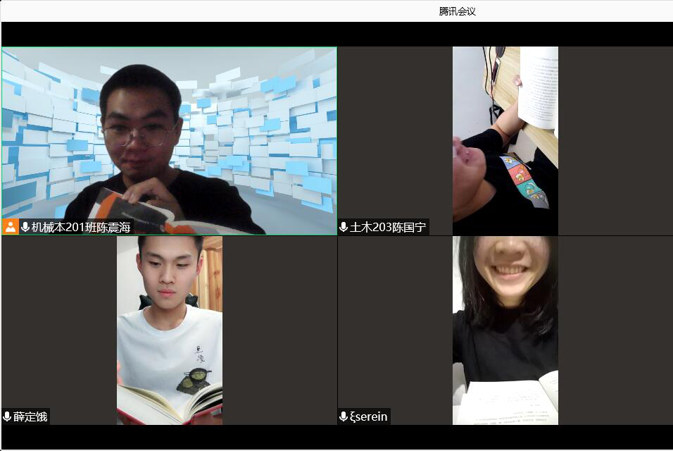 为了培养组内成员文化素养。GY-290小组成员助产201李英、机械201骆东星、土木203陈国宁、机械201陈震海于2021年1月29日在网上进行视频读书交流活动。