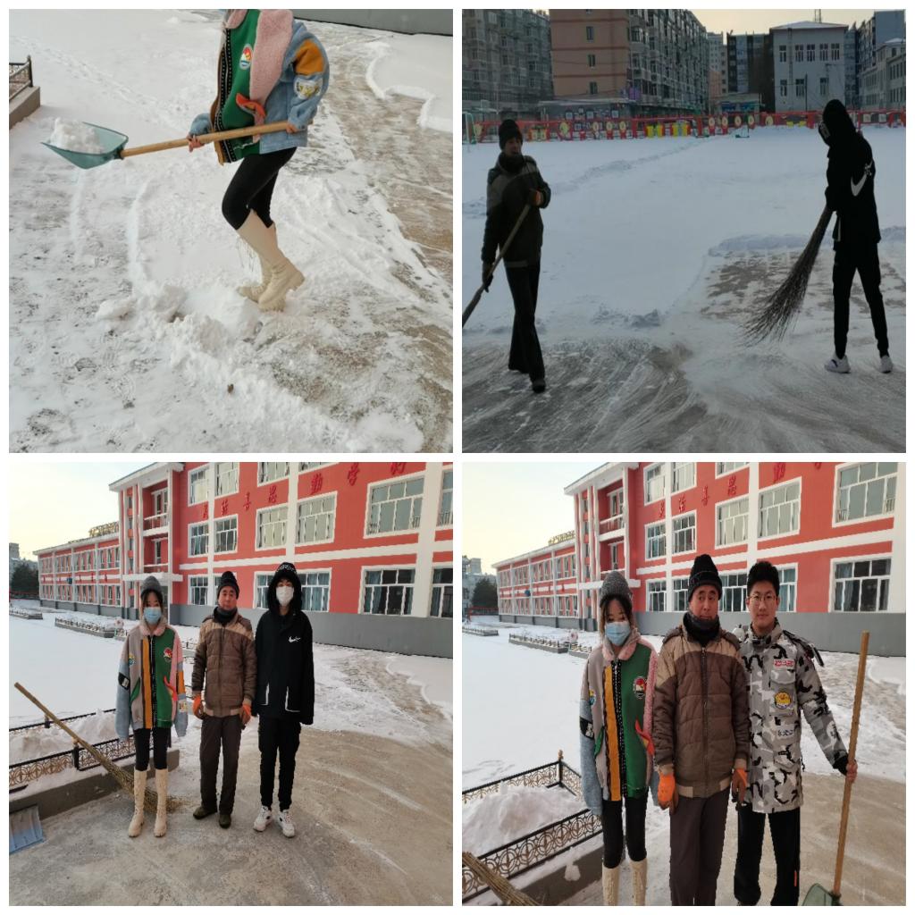 本次活动由组长王子文主持,小组成员在与校园门卫沟通交流后,拿起大扫帚、雪推板、铁铲子等扫雪工具,与校园门卫大爷一同清理学校内昨晚下的积雪。由于学校过大,雪下的也很大,校内的雪已经板结,清理难度较大。在大家互相配合下,先用清雪铲铲雪,再用扫把清理余下的细小的雪块,因为雪比较多所以我们隔不远就堆成一堆,积少成多。历经大约3小时的劳动,我们清理掉了大部分的积雪。