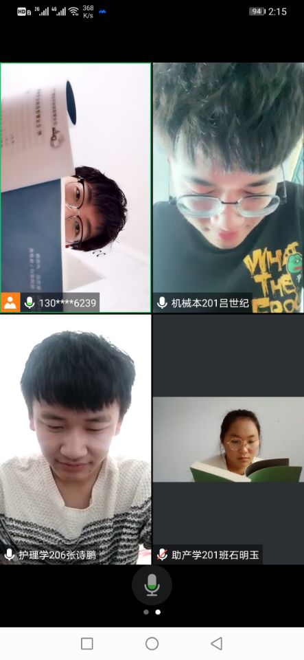 为了弘扬中国的传统文化,丰富大学生的精神世界20届机电工程系学生赵鑫宇,吕世纪,健康与护理系学生张诗鹏,石明玉,于2021年1月10日在家中利用假期时间,使用腾讯会议进行自发的读书交流学习活动,共同讨论,制造良好的网上学习环境。