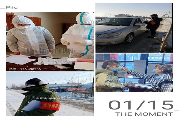 由于黑龙江省绥化地区疫情的严峻,县城全面封城,在县里发出招募志愿者公告后,我们小组成员商议后第一时间报名,小组成员经过与地方单位的沟通,1月12日开始陆续上岗,参加到了地方的志愿者大军中了。小组的刘伟涛和彭可意在村屯卡点执勤,主要负责对进入村屯人员扫码、测温、登记。虽然在外面挨点冻,但为了守护家园,值得!李超同学在社区每天进行扫码、登记,为社区人员测体温,虽然工作简单枯燥,但仍高度集中着精神。他们或身穿“红马甲”,或佩戴“红袖标”,顶风冒雪投身抗疫一线,身影穿梭在社区村屯,成为疫情防控的的一份子。