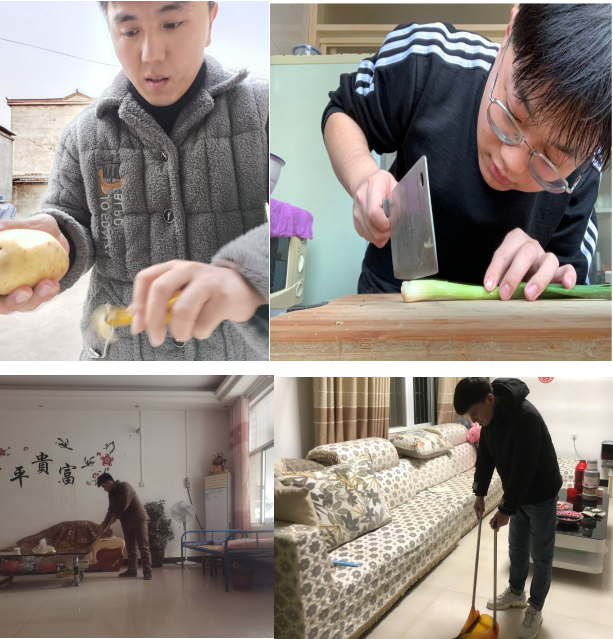 小组成员张城坡和王鸿斌同学,两人选择为父母做一顿可口的饭菜来作为这周活动的开始,从小到大都是吃着父母做的饭菜长大的,当我们亲自为父母做一顿饭菜时,父母第一时间是感慨孩子长大了,能独立了,而不是饭菜是否可口,这是父母对我们已经长大成人的肯定和满意。小组成员王伟和宁潇阳同学,两人选择承担家里的劳务工作来作为这周活动的开始,用自己忙碌的身影换下父母忙碌的身影,让在外工作一天的父母回到家中能得到休息的时光,虽然短暂,但父母脸上洋溢的幸福却是实实在在的。
