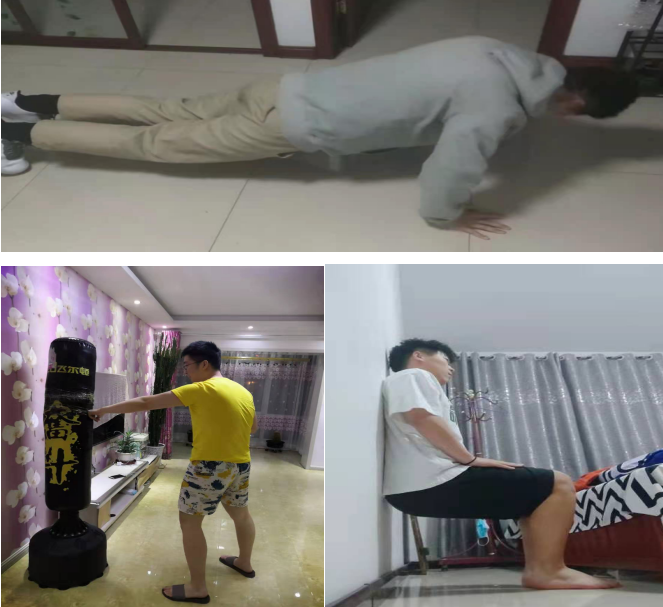 我们在居家锻炼,首先感到非常的兴奋,居家锻炼会对我们进行强心健体,虽然平时的非常缺乏有氧运动,但是做这些如俯卧撑,拳击,哑铃等,无氧训练还是得心应手,我们小组四人依旧快乐着。我们小组人员分工明确,没个人每天都进行自我锻炼。首先,我们四个人每天都进行不同的运动方式,刺激下肢,上肢肌肉能让我们有很强壮健康的身体。