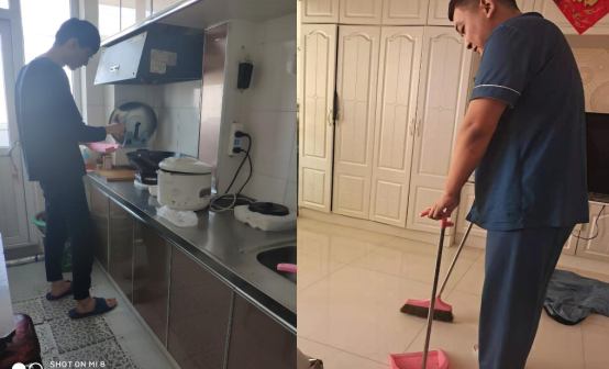 许殊瑞在家里拖地,胡晟德在家里扫地,李文强在家里洗菜做饭。当父母疲劳时,我们给他们倒上一杯浓茶,帮他们捶背;我们亲手为父母做一次饭,让父母体验我们的手艺。我们清扫地面,然后拖地。定时给家里的花草浇水,我们在做我力所能及的小事,做好家务活,让父母开心。