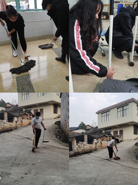 我们先和社区管理员了解了情况,他说社区活动室平时都是一些老人在这里,因为有体育设备,老人们平时没什么事就会来这里锻炼,于是我们就说免费过来打扫一下。钱留春、吴春燕和刘润辉就把地拖干净了。还将他们平时用的器材都擦拭了一遍。黄贤则将他家周围的道路上的垃圾都清扫了。