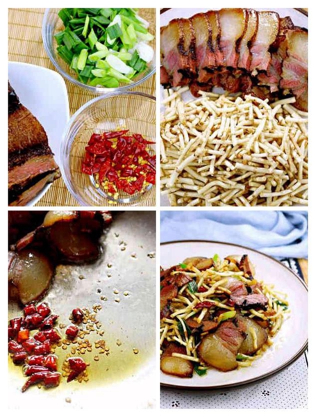 但是得注意不用金属刀具切割折耳根,可以更好地保持折耳根的原有风味。而且用手折断折耳根时,可感觉到折耳根是否鲜嫩爽脆,随时把较老的折耳根剔除。腊肉应选用有肥有瘦的带皮五花腊肉,农家腊肉色泽更深,烟薰味道更重。如果不喜欢烟薰味道,可以选用“ 风肉”,也就是不经过烟薰的腊肉来烹调。