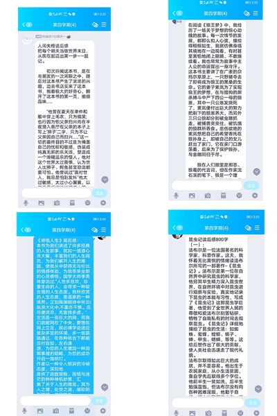 周天一阅读了《骆驼祥子》,这本书是中国现代著名作家老舍的代表作,描写了20年代,老北京的一个人力车夫的辛酸故事。李俊杰阅读了《狼王梦》,是一部长篇动物小说,是"动物小说大王"沈石溪的代表作品,里面充分体现了弱肉强食,适者生存,自由与尊严,牺牲与救赎。董千龙阅读了《昆虫记》,《昆虫记》是法国杰出昆虫学家、文学家法布尔的主要著作。作品涵盖了法布尔一生对昆虫的观察与研究,也是作品主要中心;当中也穿插了许多法布尔人生的种种经历,包括童年时期、教书的时期等。字里行间洋溢着作者本人对生命的尊重与热爱。我阅读了《感悟人生》,本书为我们讲述了许多经典的人生故事,犹如一道道心灵大餐,丰富我们的人生阅历,为我们解开人生的难题,使我从中获得无与伦比的情感体验,为我带来全新的心灵感悟。一花一世界,一叶一菩提,阅读这本书不但让我爱的深沉博大,还让我更加自信地去追逐内心的憧憬与梦想。
