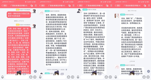 活动开始,每个小组成员开始收集有关自己家乡的信息情况,收集好之后,经过整理发在群里进行介绍,其中有一个小组成员唐梓桐的家乡特别能展现广西特点,俗话说桂林山水甲天下,没错广西山水美如画。当听唐梓桐介绍家乡时,让我们感受到了广西美丽,为我们广西拥有这么美丽的地方而自豪。