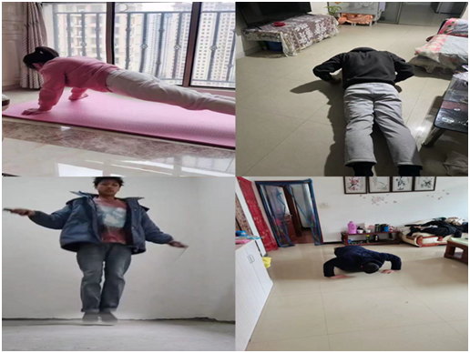 杨宇博和张冉鑫在家做俯卧撑,毕荣跳跳绳,邹穗凤同学做平板支撑