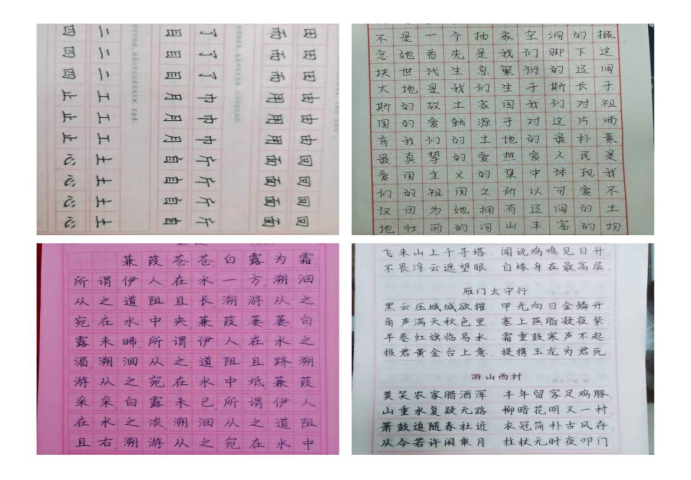 活动中,每个人写好的临摹作品发到微信群聊中,四个人既有优点又有缺点。每个人都讲了自己在临摹中的感受和注意的问题,例如练字要坚持不懈,练字要坚持不懈,不要忽冷忽热,要严谨,严格按照字体规范来写制定练习计划。要有一个联系计划,每天坚持练习多长时间字是“门面”,练习书法也有很多优点;书法具有广泛的实用性。学书法最基本的活动是写字,而写字首要的目的是为了记事和交流感情。一手好字,受益一生。