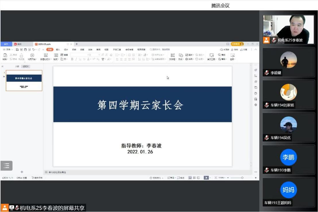 为使学生及家长更加明确第四学期的相关内容,检查同学们前两周任务的完成情况,指导教师李春波于1月26日晚通过腾讯会议召开第四学期云家长会。车辆专业19级学生和家长共同参会。
