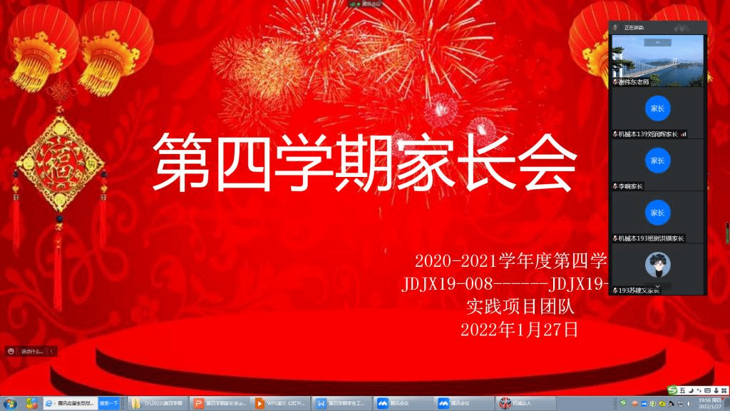 2022年1月27日晚,JDJX19-008-014实践项目团队由生涯导师谢伟东召集并通过腾讯会议主持召开了家长会。
