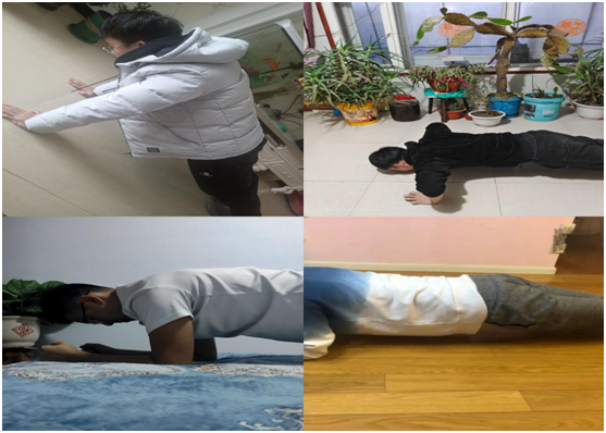 我们小组每个人都做了自己认为适合自己的运动,梅与同和贺金宇做了俯卧撑,孙景阳做了平板支撑,黄金泽做了仰卧起坐,除了这些,我们还进行了跳绳比赛,最后获胜的是贺金宇,他跳了100多下。