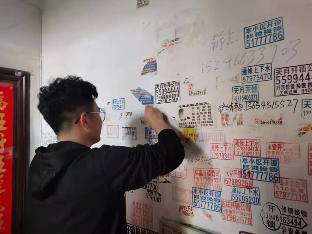 本次活动主要针对针织厂家属院的楼道、墙面、公共设施等乱张贴小广告进行清理,小广告不仅影响社区美观,其中包含的一系列虚假信息还会导致一些居民上当受骗,铲除小广告势在必行。在清理现场,社区工作人员不怕脏不怕累,拿着小铲、水桶等工具,对楼道内的墙体、楼道及楼道扶手上的小广告进行了彻底清理,还有些粘贴牢固不易清理的小广告,将用手一点一点将其撕离墙体。