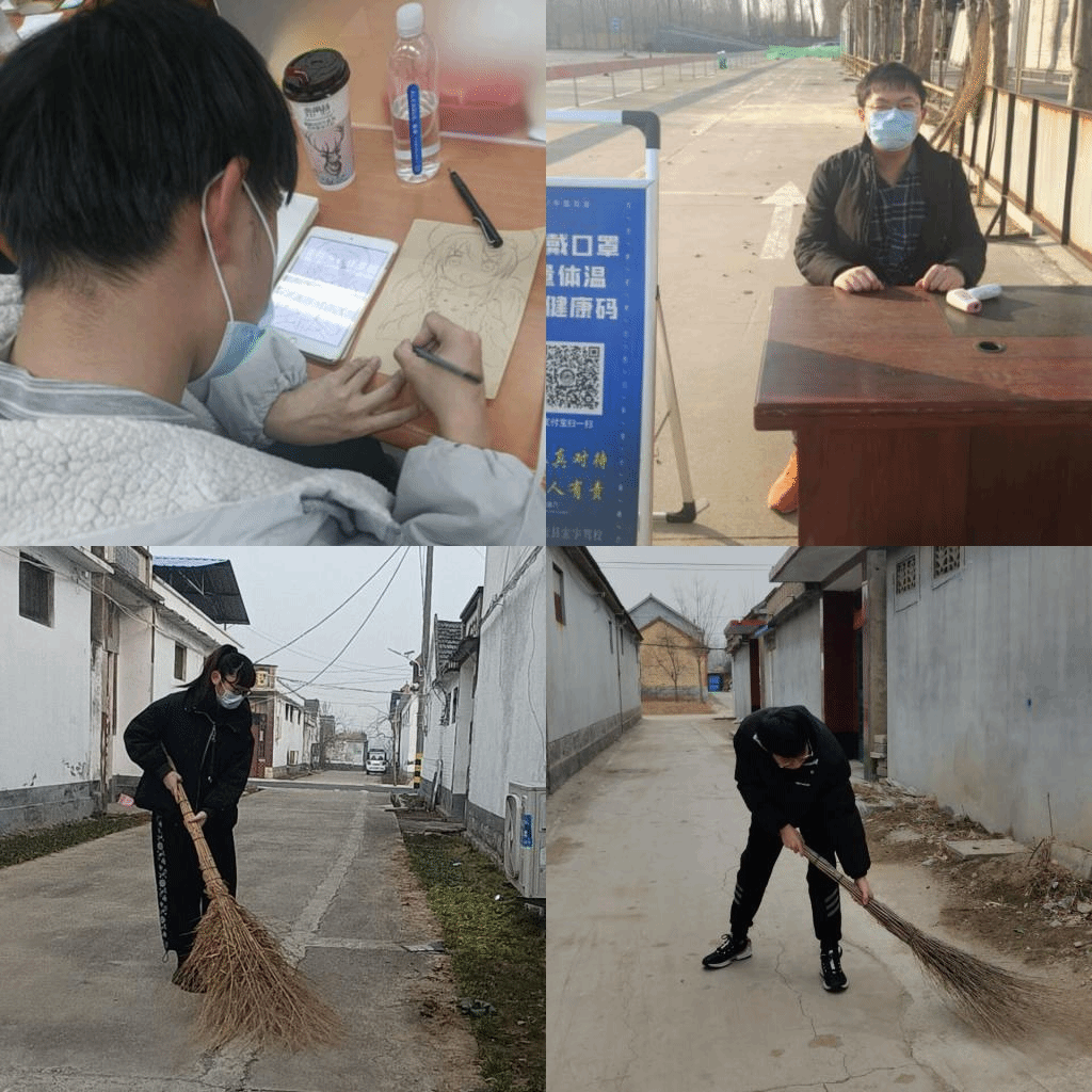 李庆霖同学于1月14日做好防疫措施,在山东省图书馆绘制了“爱护小动物”主题手抄报,配有“可以不爱,但别伤害”的标语,并将成品发布于网络,得到了许多响应与共鸣,他讲道:“我家中养猫养狗,但从网络上得知许多人有虐待宠物、屠杀小动物的扭曲心理,心中愤慨,故以此方式呼吁大家爱护小动物。”樊锐同学于1月16日在山东省聊城市冠县宏宇检测站进行疫情防控工作,为来往行人测体温、检查是否佩戴口罩、健康码是否正常、返乡是否有核酸检测等,樊锐同学讲道:“疫情尚未结束,我们不能懈怠,要做好出行防护”。李长甜同学于1月26日在山东省济宁市王因街道辛集村进行街道清扫志愿工作,邓文吉同学于1月28日于山东省日照市莒县浮来山镇后栗园村清扫街道卫生,二人均表示:“爱护环境,人人有责!”。