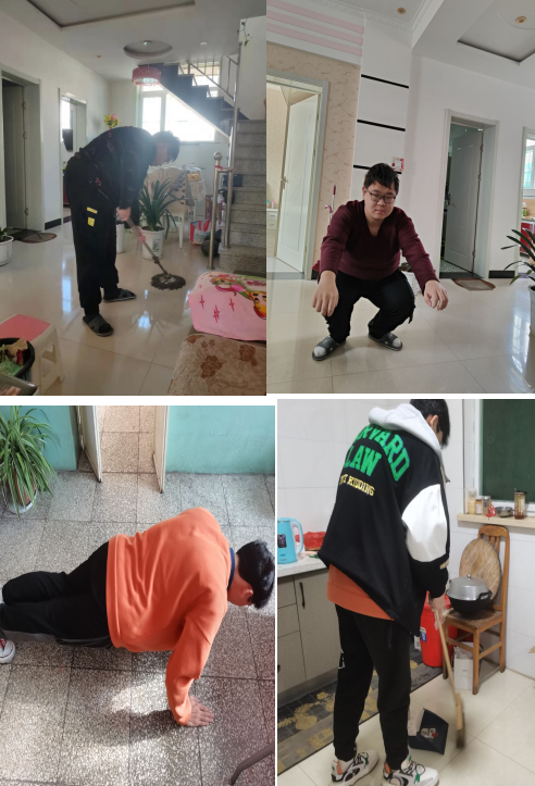 JDDQ20-012小组成员杨文宇在家进行深蹲的居家锻炼和拖地的感恩实践,焦梓铠进行俯卧撑的居家锻炼和扫地的感恩实践,刘文帅进行拉伸运动的居家锻炼和拖地的感恩实践,李钊宇进行俯卧撑的居家锻炼。