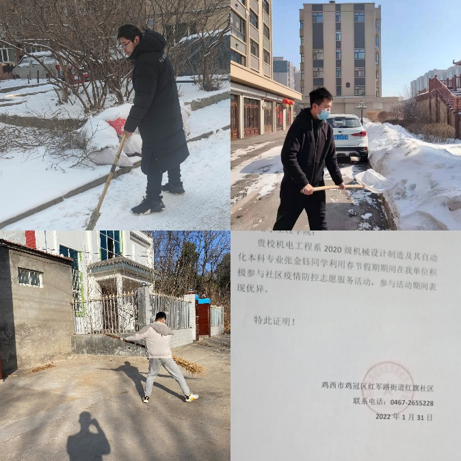 小组成员们在遵守当地疫情防控要求的前提下,协助社区对当地环境进行了清理。除了清扫垃圾,还进行了铲除积雪,协助测温等一系列工作。在进行活动时,小组成员始终秉承着尽心尽力,不怕吃苦,勇于奉献的精神,哪怕环境再艰苦,也依然坚持完成了自己的任务。