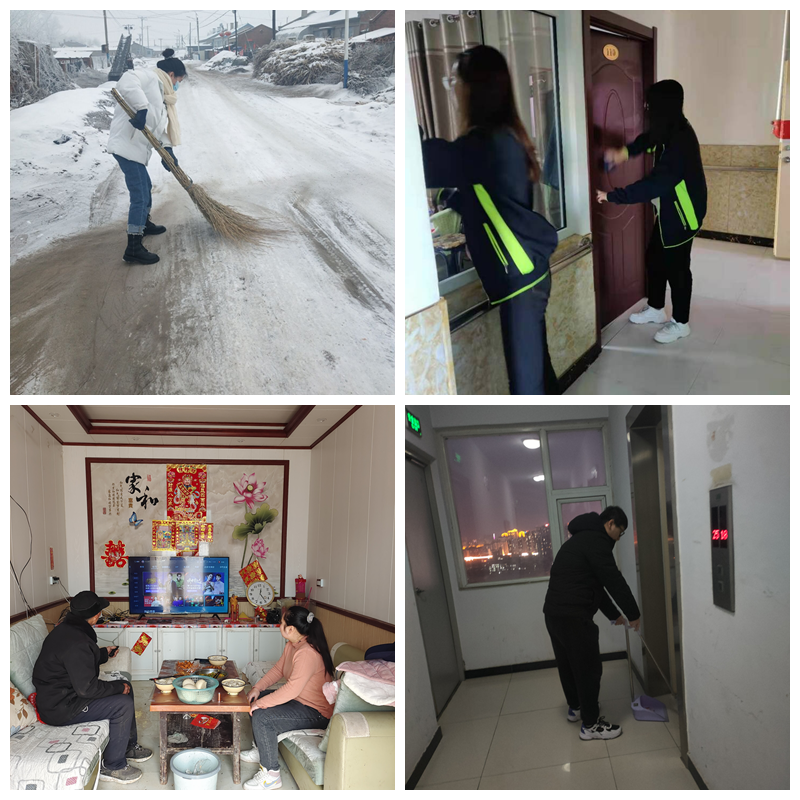 李玉莹同学去到社区空巢老人家中,为老爷爷做了一桌可口的午饭,陪老人聊天、看电视,给老爷爷送去自己的一份祝福。杨佳欣同学在社区活动中帮助打扫卫生,杨雨欣同学在家乡的道路上开展自愿扫雪活动。李瑞龙同学在社区里进行楼道打扫活动。大家通过此次活动既帮助了别人也锻炼了自己的身体,同时增强了自己的责任感。