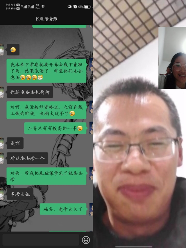 我组钱留春、刘泽昆同学给自己的班主任打了视频电话,给老师拜了年,问候了最近的身体状况,还表示等疫情过去一定会登门拜访,对在校时的教育以及关怀照顾表示感谢。老师说很欣慰我还能记得给他打电话,接到我的电话表示很开心,但是不管过了多久老师还是那句话的好好学习,不能荒废时光,该学习的时候不能马虎,该放松的时候也不能硬撑。沈韬、李林喜则是给班主任发了微信消息进行问候,沈韬同学说现在学校的竞争压力很大,老师给了一些建设性的意见和建议,并且说现在工作不仅要学历还需要各种证书,在完成学业的同时考取一些证书很是重要。李林喜问了老师关于考研的问题,老师也是耐心的给他讲解了一些需要考虑的一些因素。