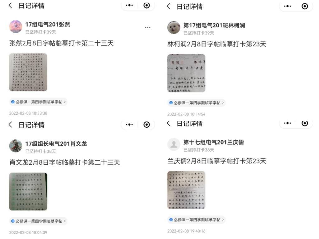 2022年2月9日,JDDQ20-017小组成员电气本201肖文龙、兰庆儒、张然、林珂润为积极响应学校,在家进行临摹字帖活动,并上传打卡。