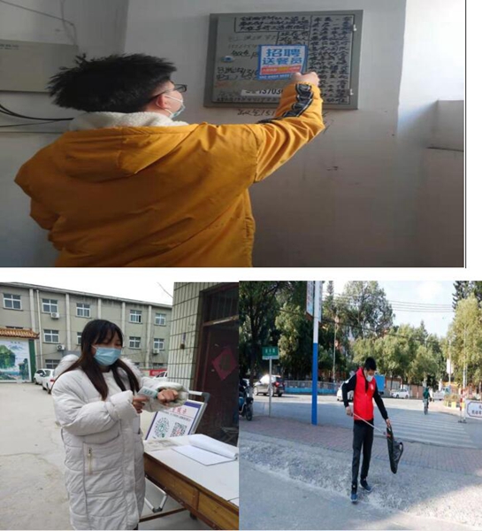 崔萌珂同学,积极响应学校号召,返乡后担任乡村防疫志愿者,每日在乡村卡点处排查登记出入人员并进行扫码测温,登记出入车辆核查健康码行程码,在疫情防控点每日进行消毒。为了营造一个美丽清洁的社区氛围,让居民们在空气新鲜、环境幽雅的社区生活。张梦男同学在当地社区打扫街道,每天打扫社区草坪纸屑烟头,清理积存垃圾和摆放不当的物品,捡拾街道的白色垃圾,为自己生活的社区卫生贡献自己的一份力。为抵制社区小广告随意张贴现象,张柏然同学和社区负责人联系,在所在社区开展清理小广告志愿者活动,清理包括楼道里和小区门口在内的小广告以及居民楼外墙体的小广告。