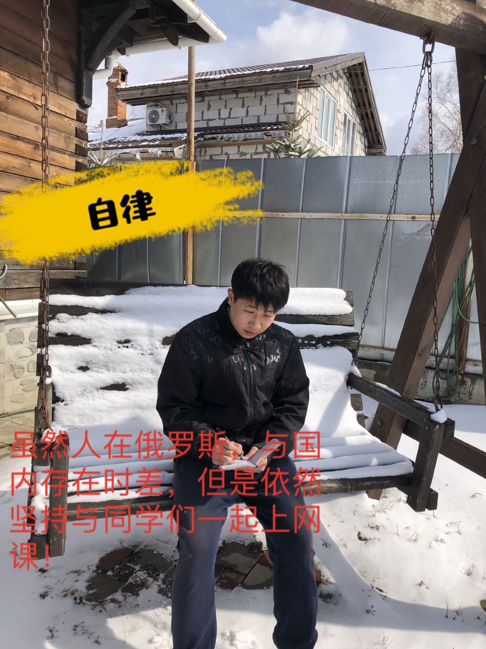 机械本183班于涛,家在亚布力镇的小村庄,因为家里信号弱,只能在村里高地的乌篷下信号儿才能好点儿白茫茫雪地宁静的世界,听着课写着笔记,这种感觉很棒。