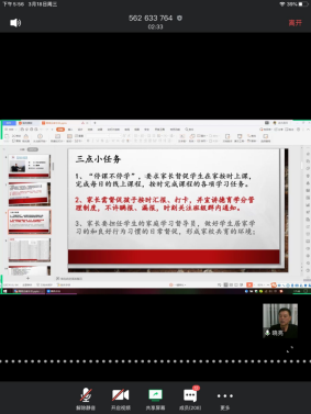 通过这次网络家长会,屏幕两端,师生、家长见屏如面。家校配合,家校同向,家校同心,家校共育,“硬核”做好疫情防控。充分利用学校提供的网络平台,让学生们在这个特殊的长假养成自律、自主学习的好习惯,尤其是在当前线上教学中,做到自觉自律。待到春暖花开,同学们重返校园。