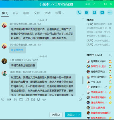 又一年的清明节要到了,4月2日这天机械本172班在线上召开缅怀革命先烈激发爱国情怀的主题班会,本次团活由团支书带领开展,同学们纷纷用自己的话表达自己对革命先烈的缅怀。