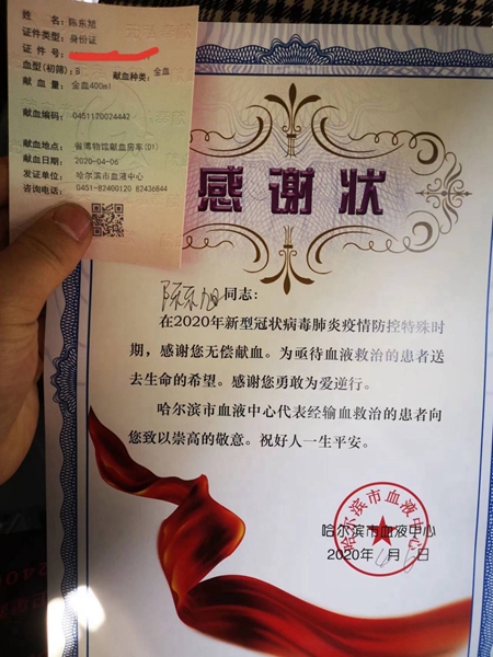 机电工程系机械本182班陈东旭是班级团支书,居住在黑龙江省哈尔滨市呼兰区康金街道永贵村,在疫情来临的时候主动参与到村里的疫情检查站工作,并无偿献血。哈尔滨市血液中心感谢他在2020年新型冠状病毒疫情防控的特殊时期,无偿献血,为亟待血液救治的患者送去生命的希望。