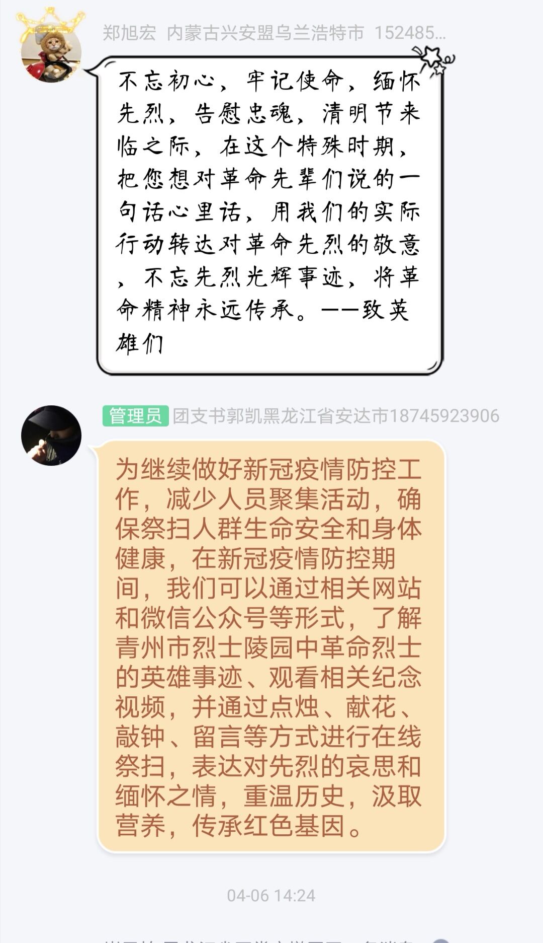 团支书郭凯要求大家通过相关网站和微信公众号等形式,了解革命烈士的英雄事迹、观看相关纪念视频,并通过点烛、献花、敲钟、留言等方式进行在线祭扫,表达对先烈的哀思和缅怀之情,重温历史,汲取营养,传承红色基因。此次团活班级采用群内互动的方式进行,同学们踊跃发言,寄托了对英雄们的无限哀思和继承先烈遗志的决心。